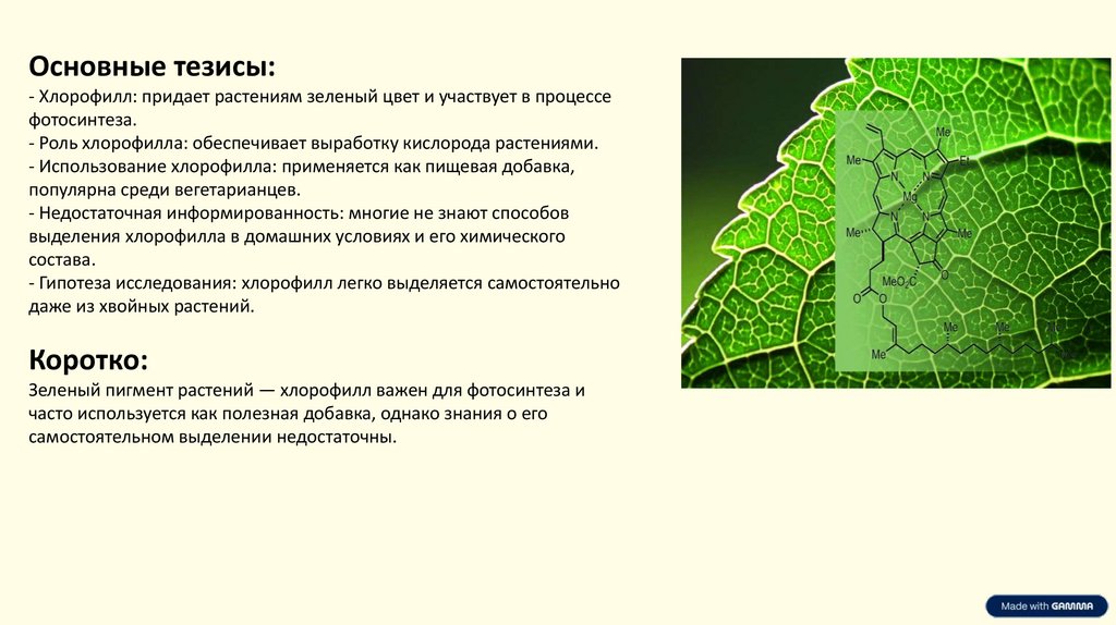 Основные тезисы:- Хлорофилл: придает растениям зеленый цвет и участвует в процессе