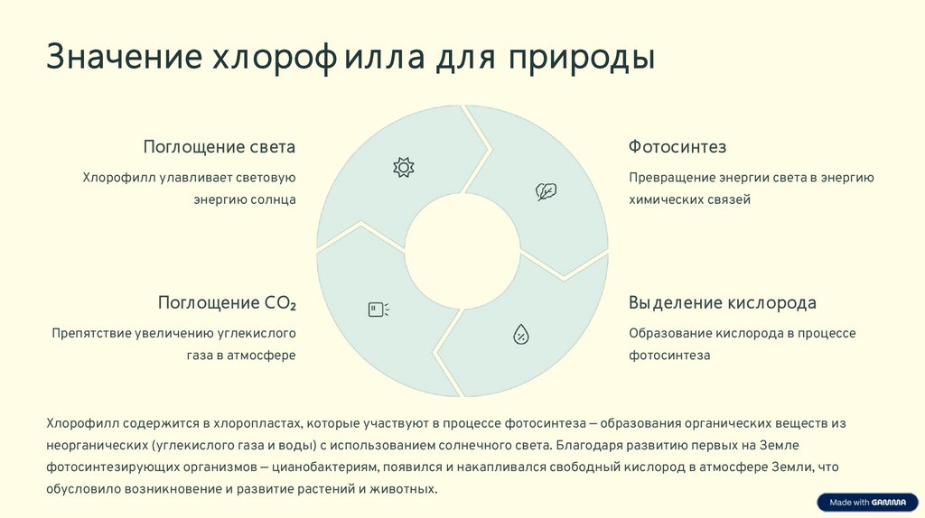 - Роль хлорофилла: обеспечивает выработку кислорода растениями.