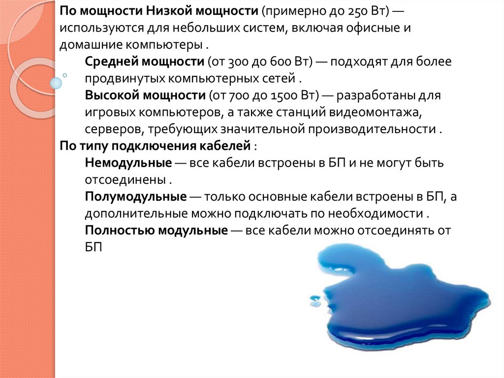 По мощности Низкой мощности (примерно до 250 Вт) —используются для небольших систем, включая офисные и