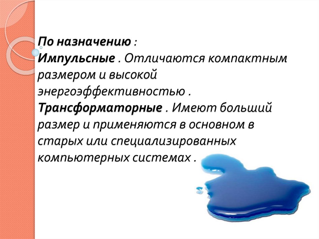 6. По назначению : Импульсные . Отличаются компактным размером и высокой энергоэффективностью . Трансформаторные . Имеют больший