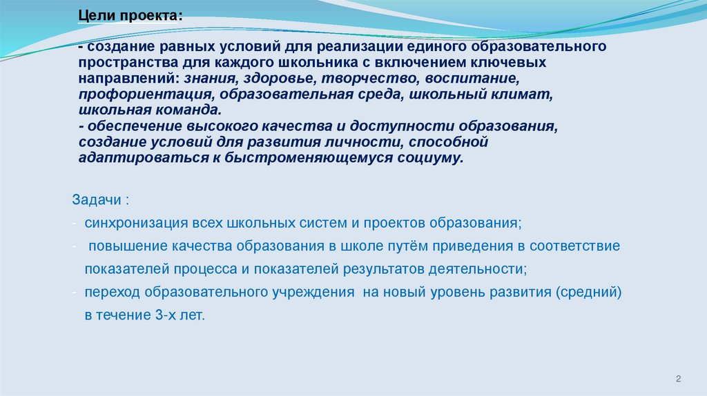 Цели проекта:- создание равных условий для реализации единого образовательного