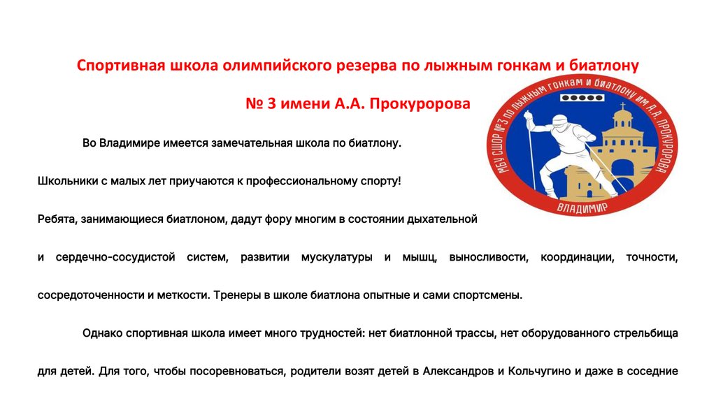 Однако спортивная школа имеет много трудностей: нет биатлонной трассы, нет оборудованного стрельбища