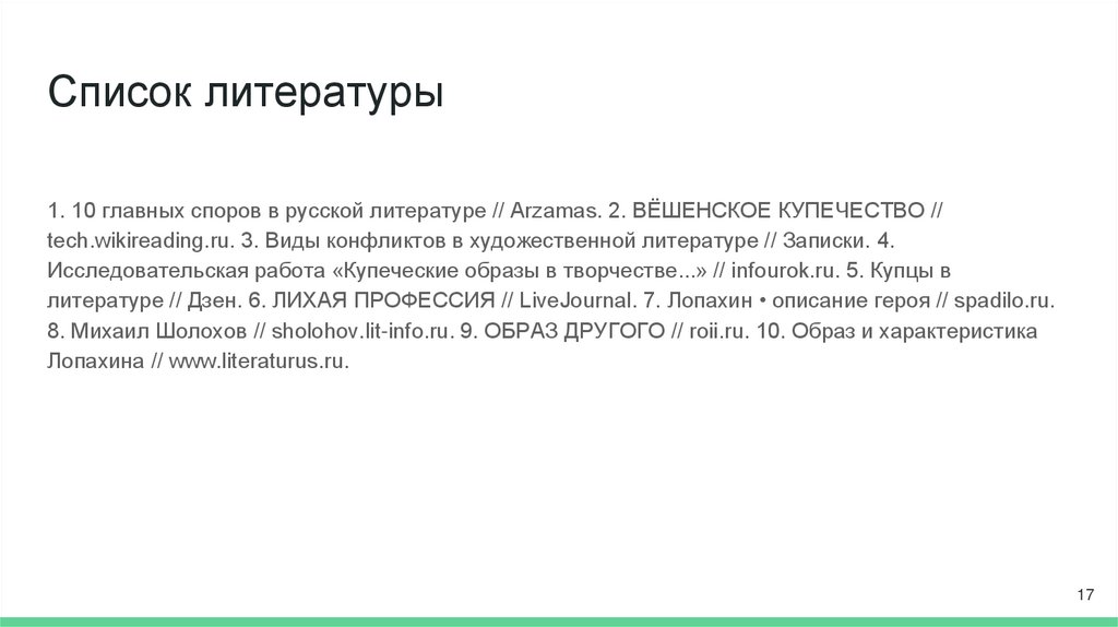 Список литературы1. 10 главных споров в русской литературе // Arzamas. 2. ВЁШЕНСКОЕ КУПЕЧЕСТВО //