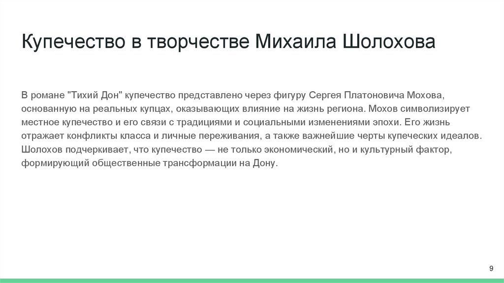 Купечество в творчестве Михаила ШолоховаВ романе "Тихий Дон" купечество представлено через фигуру Сергея Платоновича Мохова,