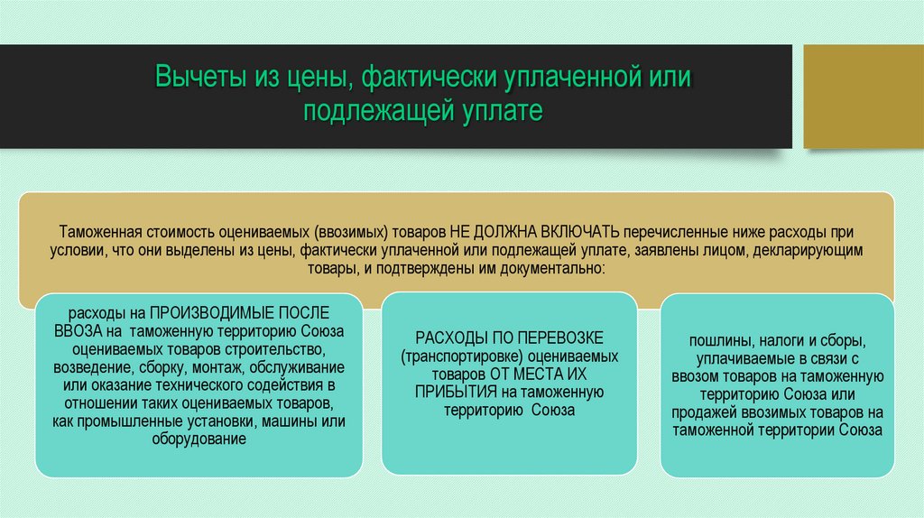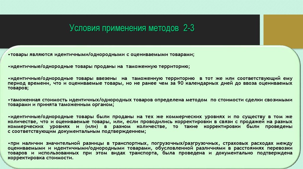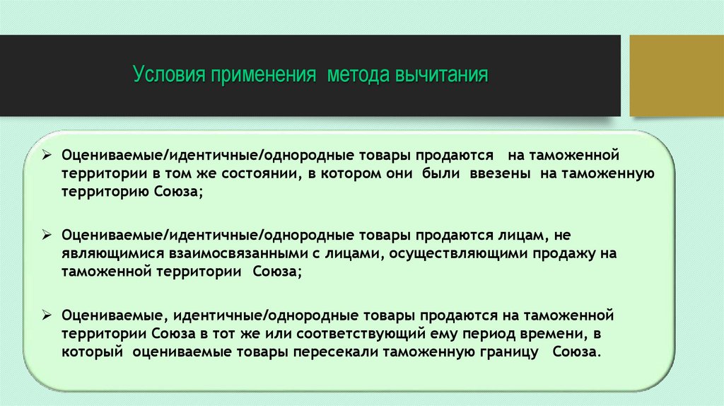 Условия применения метода вычитанияОцениваемые/идентичные/однородные товары продаются на таможенной