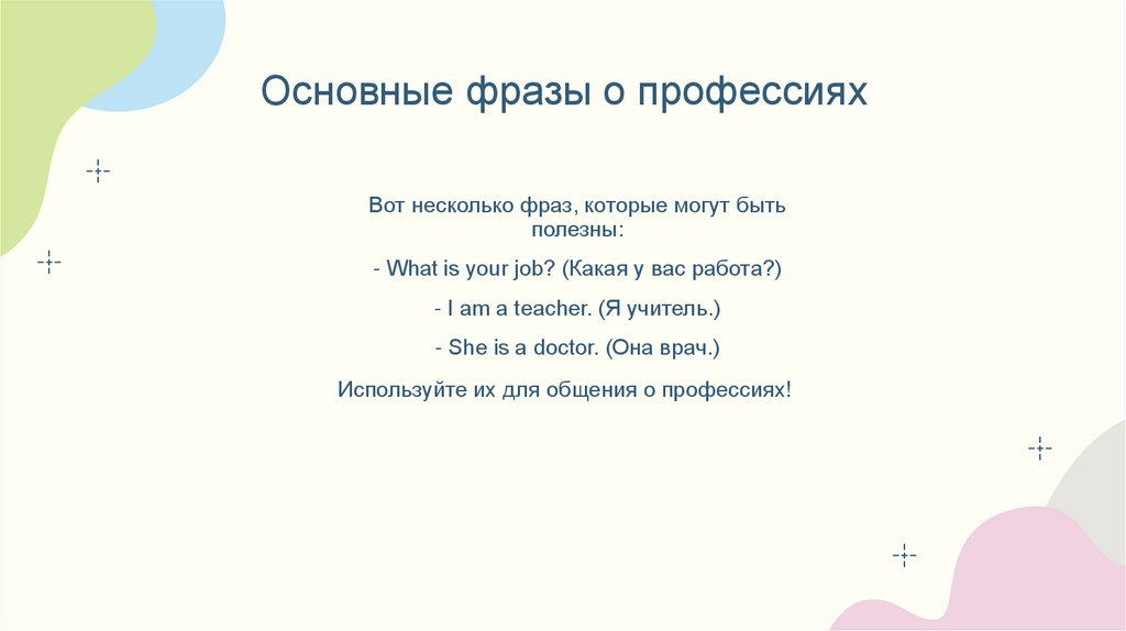 Основные фразы о профессияхВот несколько фраз, которые могут быть