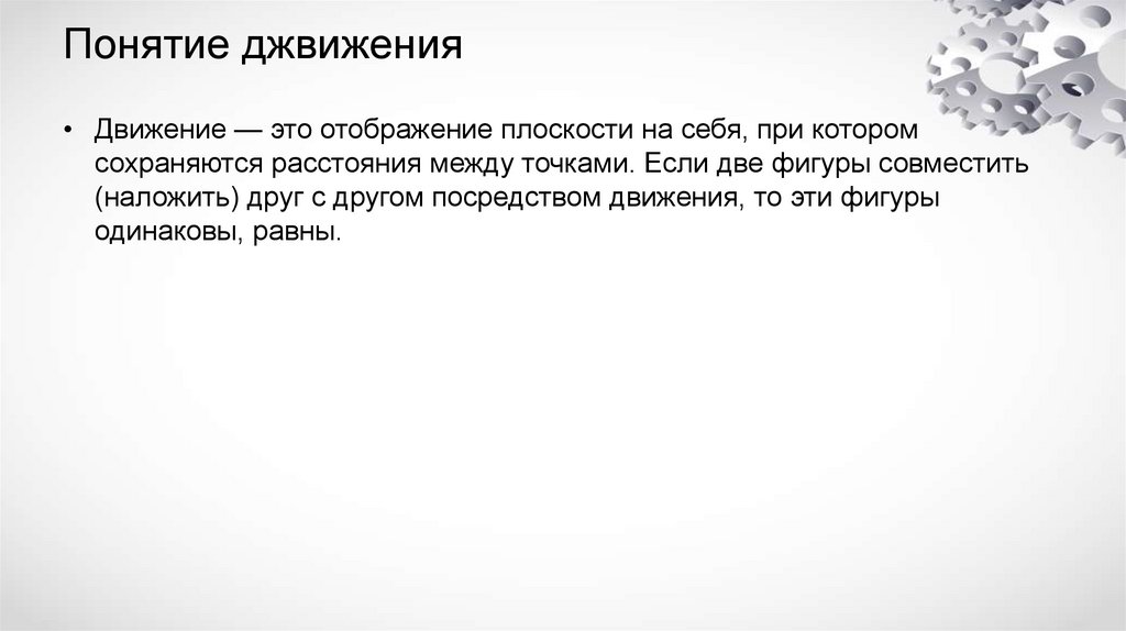 Понятие джвижения• Движение — это отображение плоскости на себя, при котором