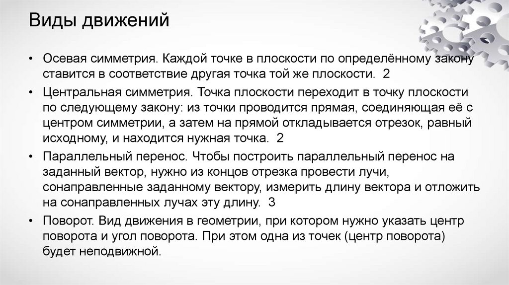 Виды движений• Осевая симметрия. Каждой точке в плоскости по определённому закону