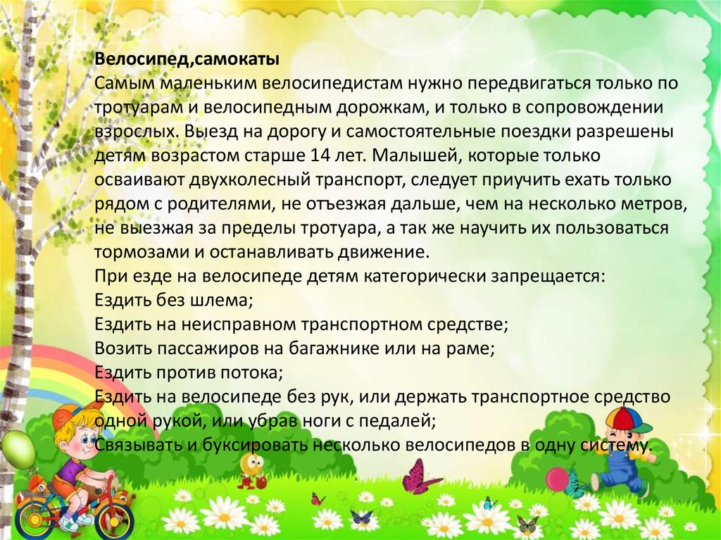 Велосипед,самокатыСамым маленьким велосипедистам нужно передвигаться только по