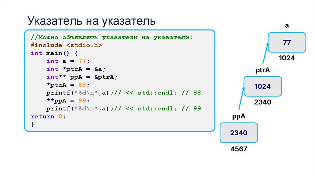Указатель на указатель//Можно объявлять указатели на указатели: