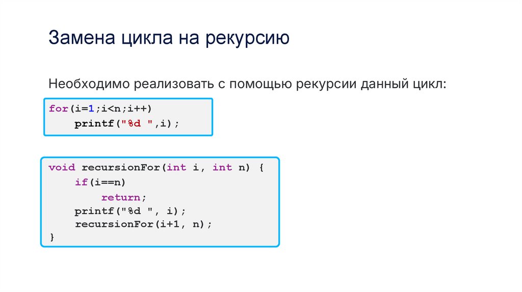 Замена цикла на рекурсиюНеобходимо реализовать с помощью рекурсии данный цикл: