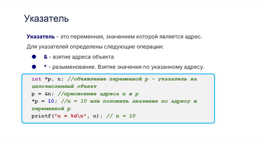 int *p, n; //объявление переменной p - указатель на