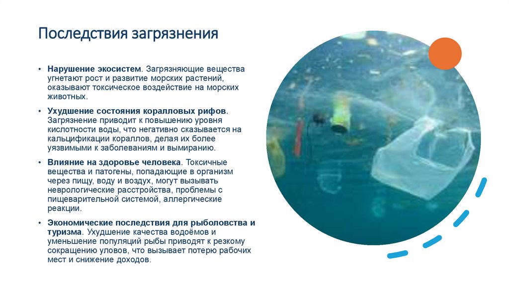 • Нарушение экосистем. Загрязняющие веществаугнетают рост и развитие морских растений,
