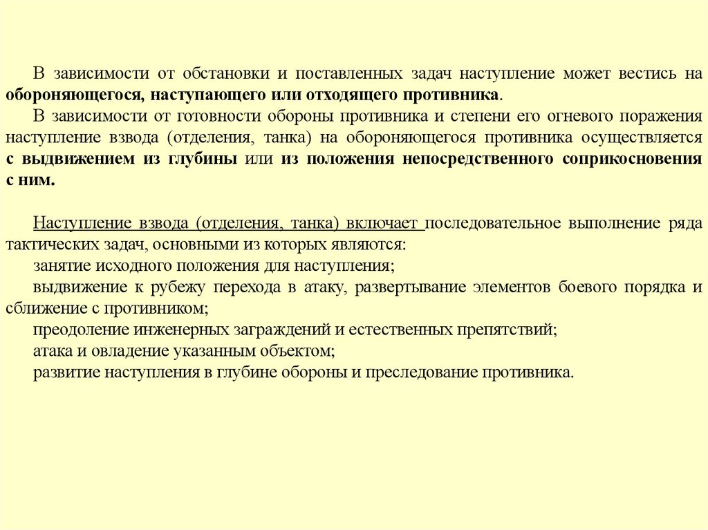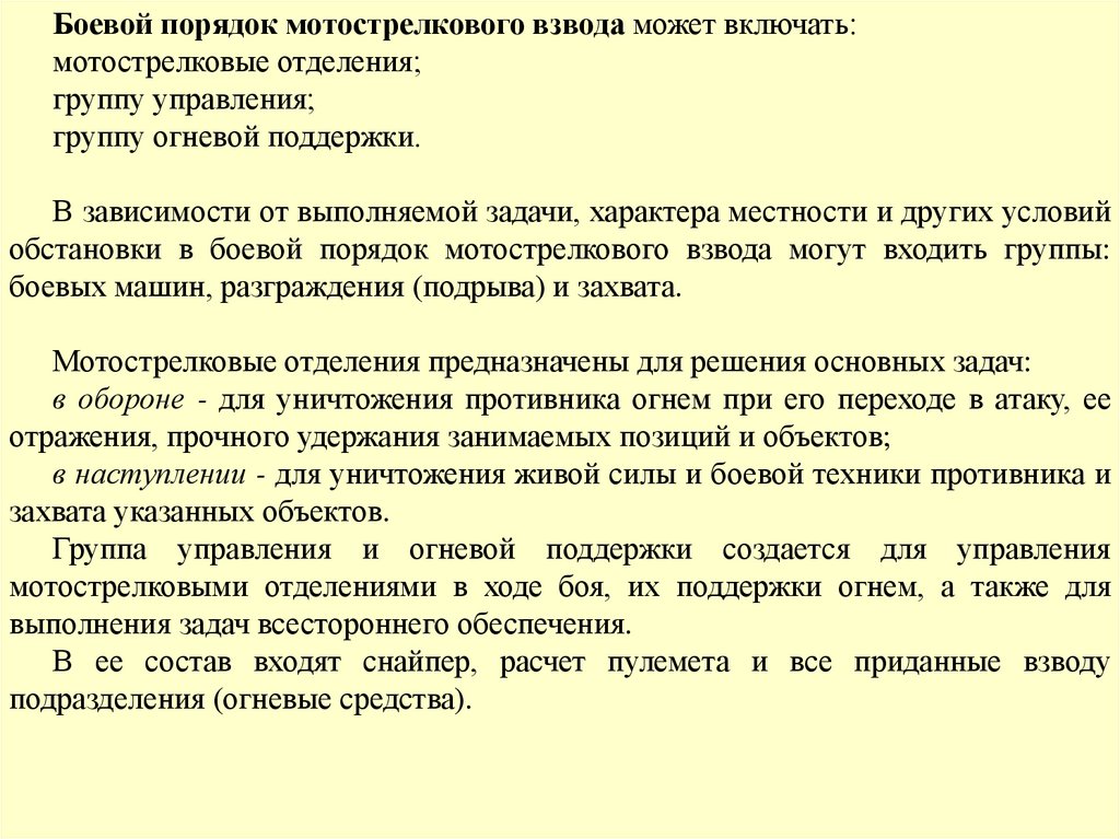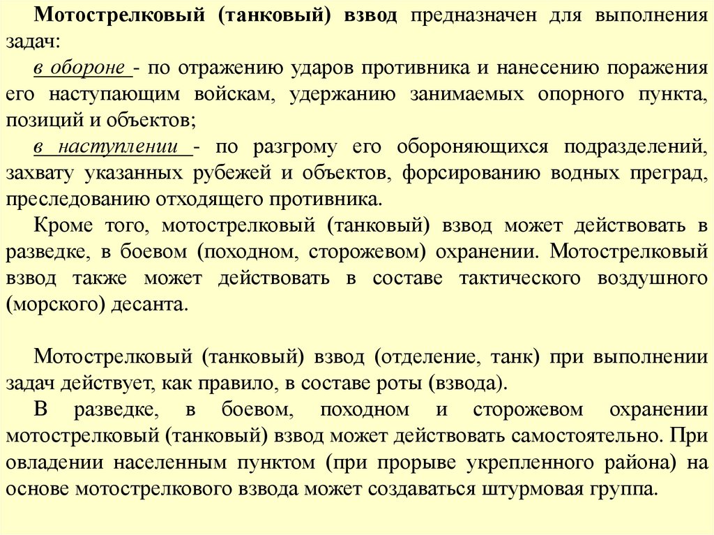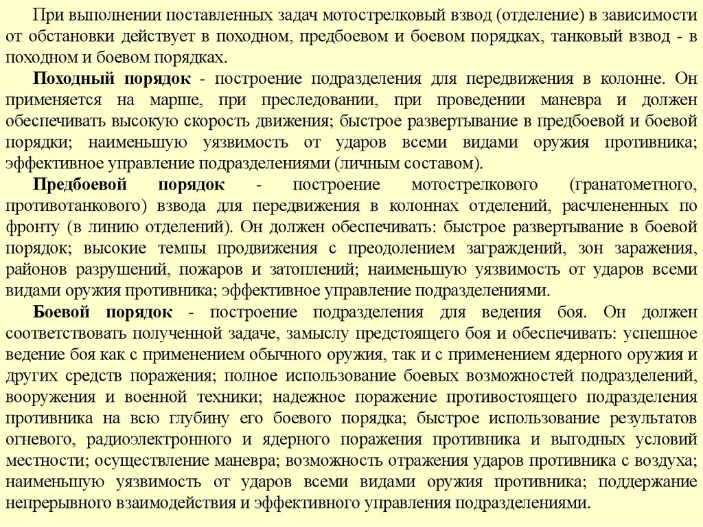При выполнении поставленных задач мотострелковый взвод (отделение) в зависимостиот обстановки действует в походном, предбоевом и боевом порядках, танковый взвод - в