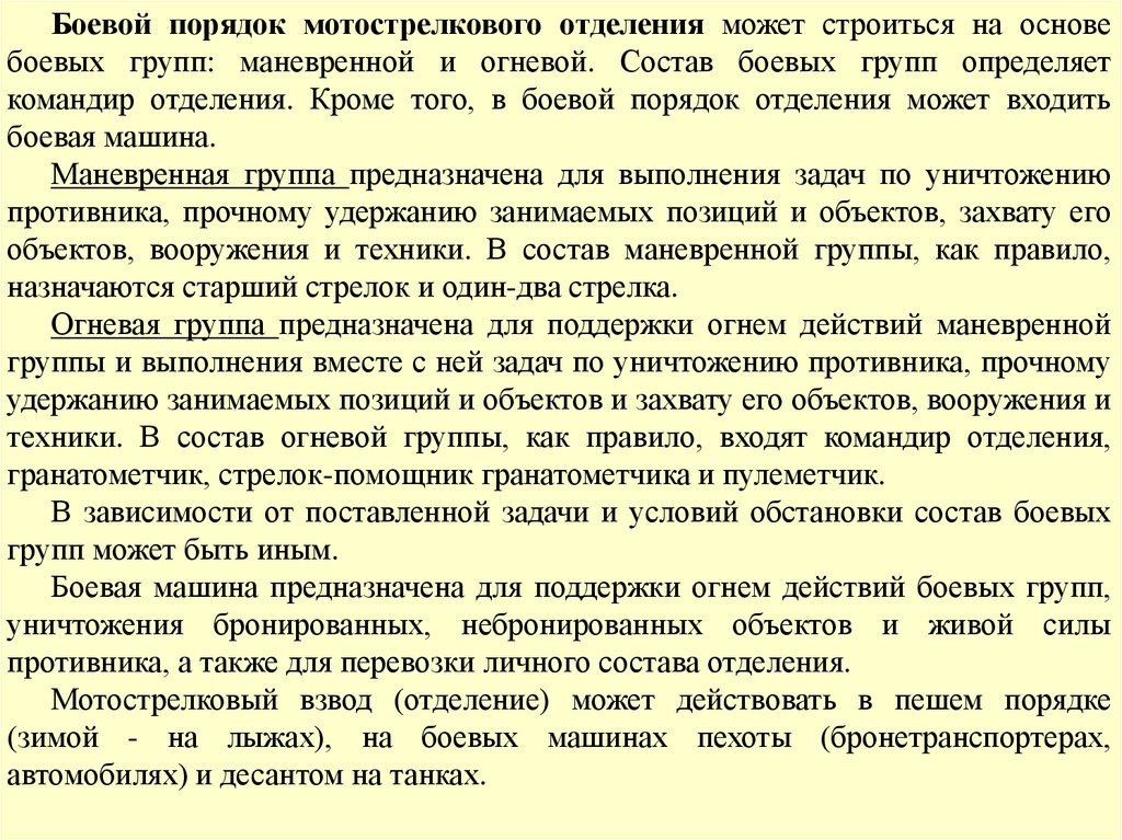 Боевой порядок мотострелкового отделения может строиться на основебоевых групп: маневренной и огневой. Состав боевых групп определяет