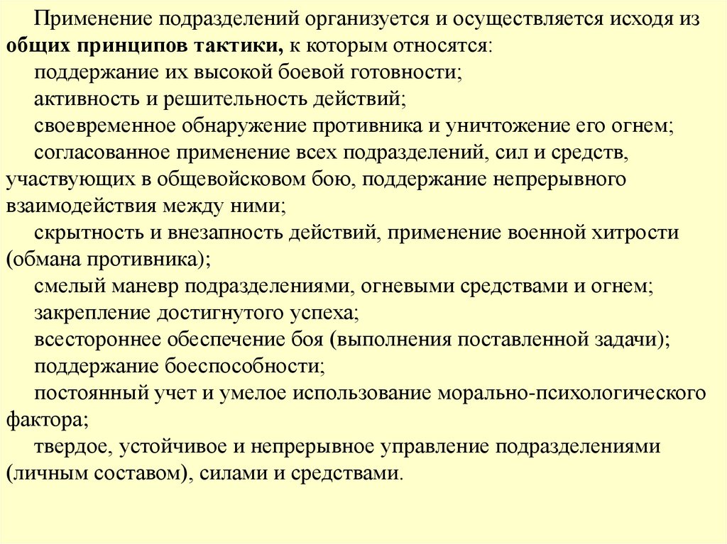 Применение подразделений организуется и осуществляется исходя изобщих принципов тактики, к которым относятся:
