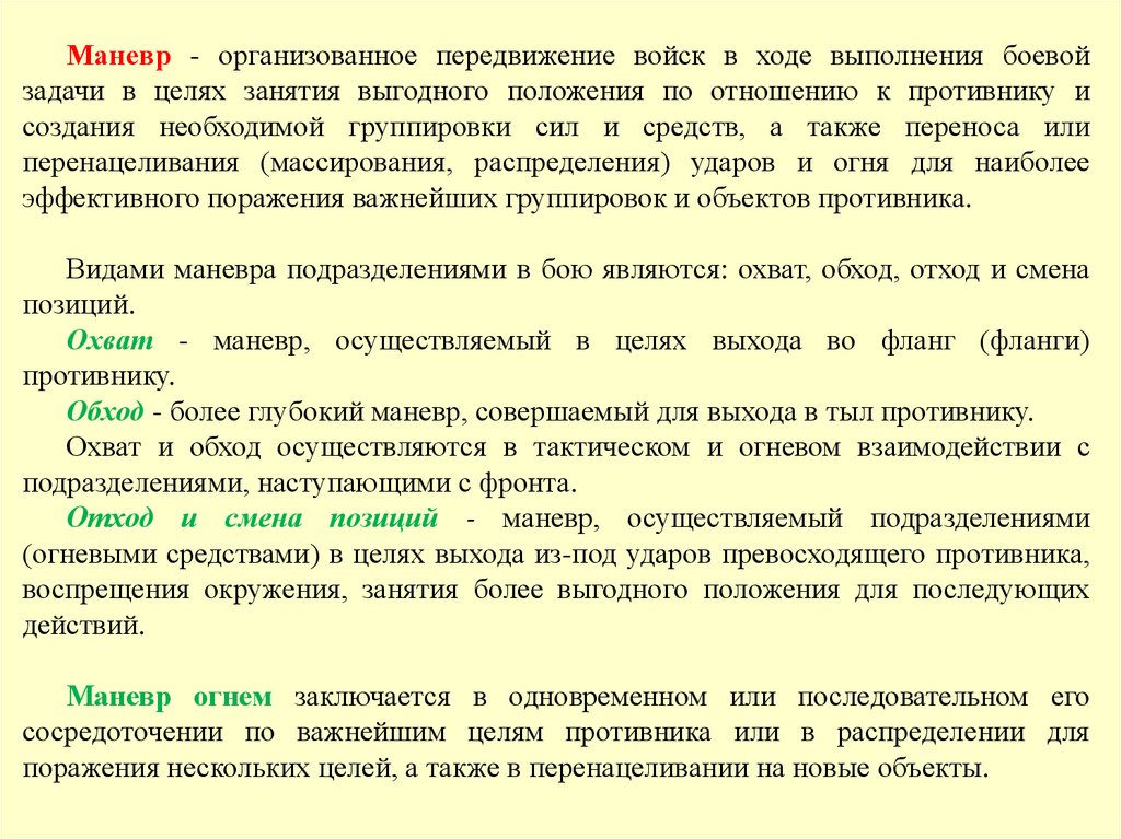 Маневр - организованное передвижение войск в ходе выполнения боевойзадачи в целях занятия выгодного положения по отношению к противнику и