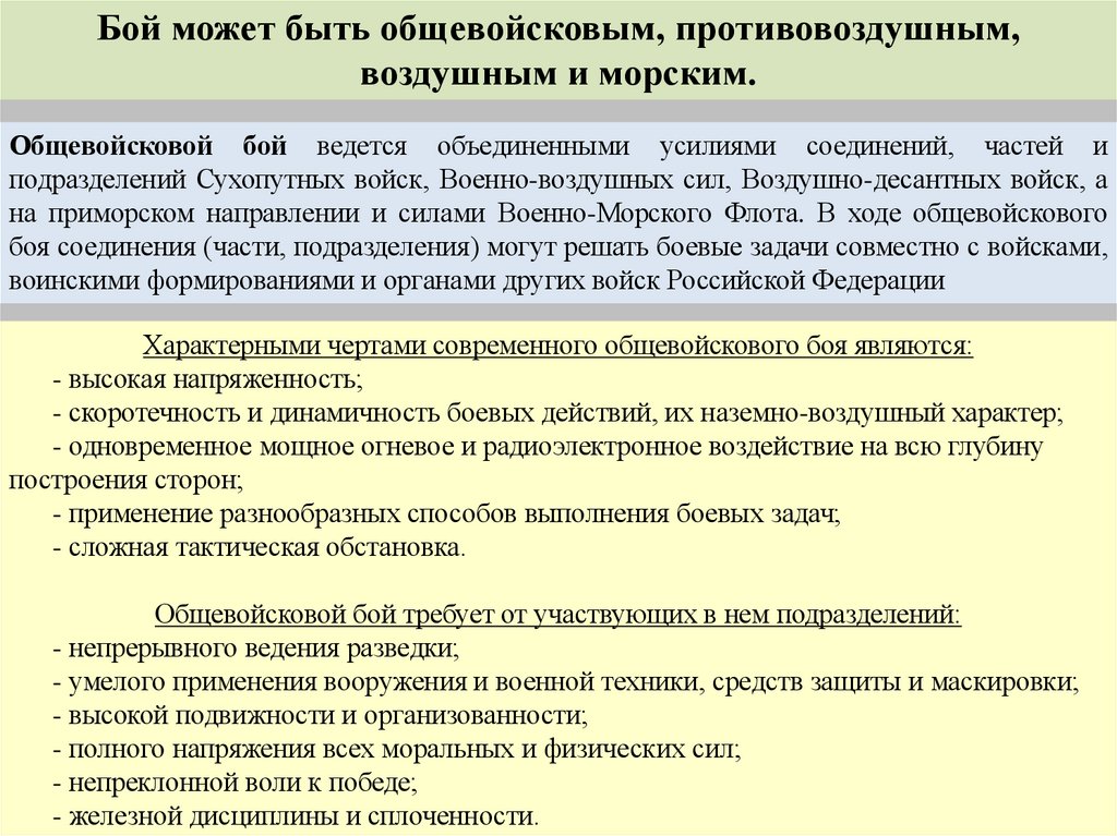Бой может быть общевойсковым, противовоздушным,воздушным и морским.