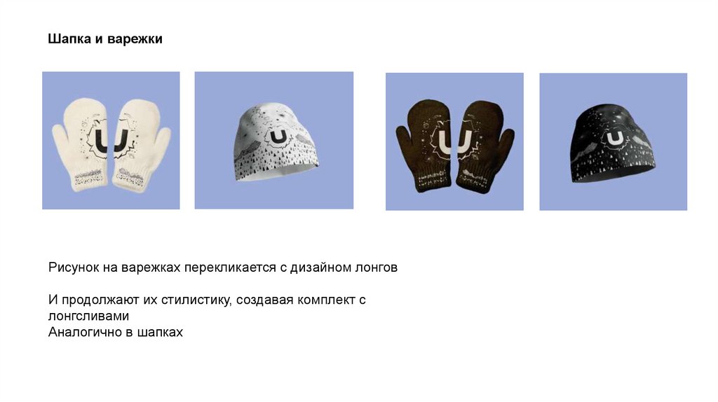 Шапка и варежкиРисунок на варежках перекликается с дизайном лонгов