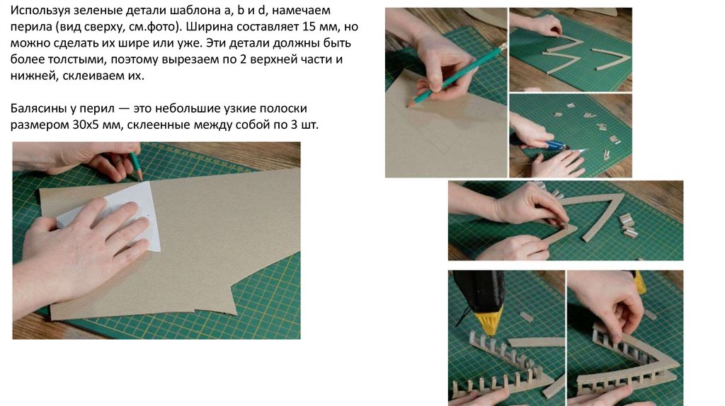Используя зеленые детали шаблона a, b и d, намечаемперила (вид сверху, см.фото). Ширина составляет 15 мм, но