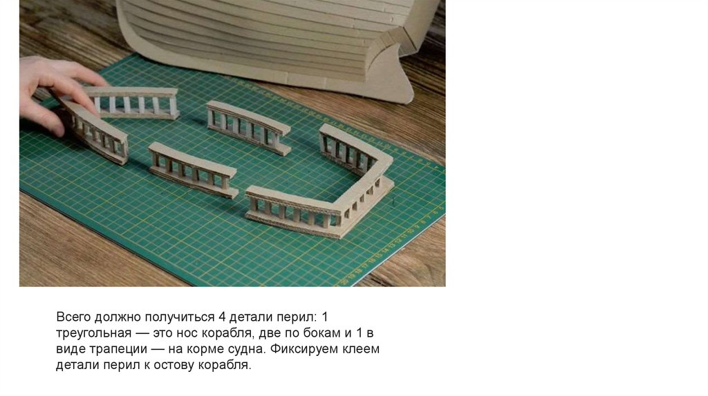 Всего должно получиться 4 детали перил: 1треугольная — это нос корабля, две по бокам и 1 в