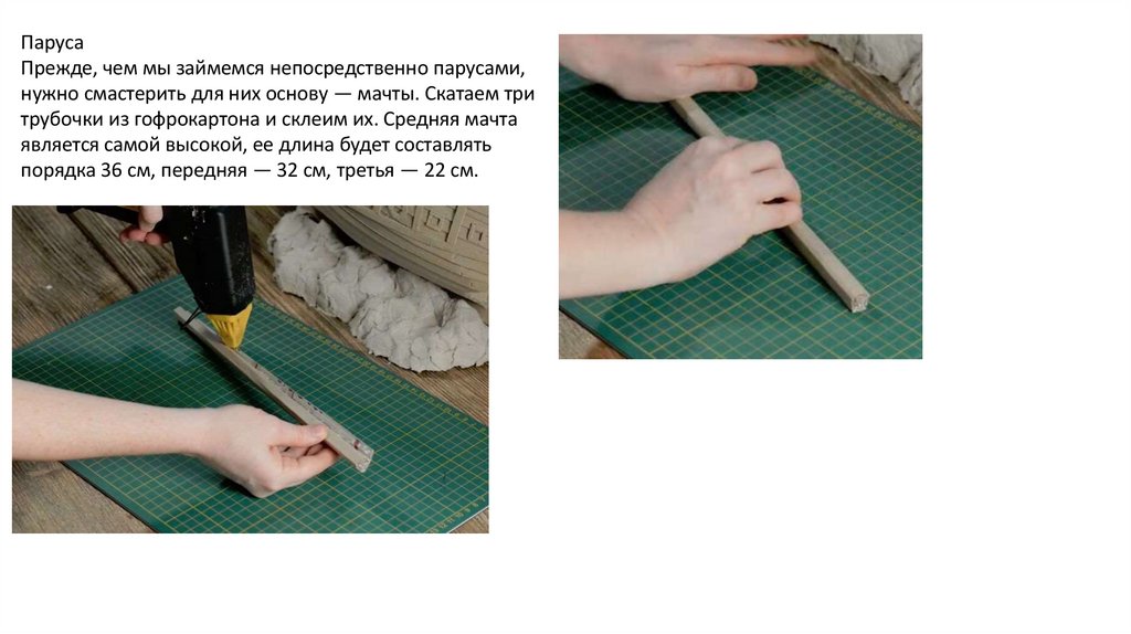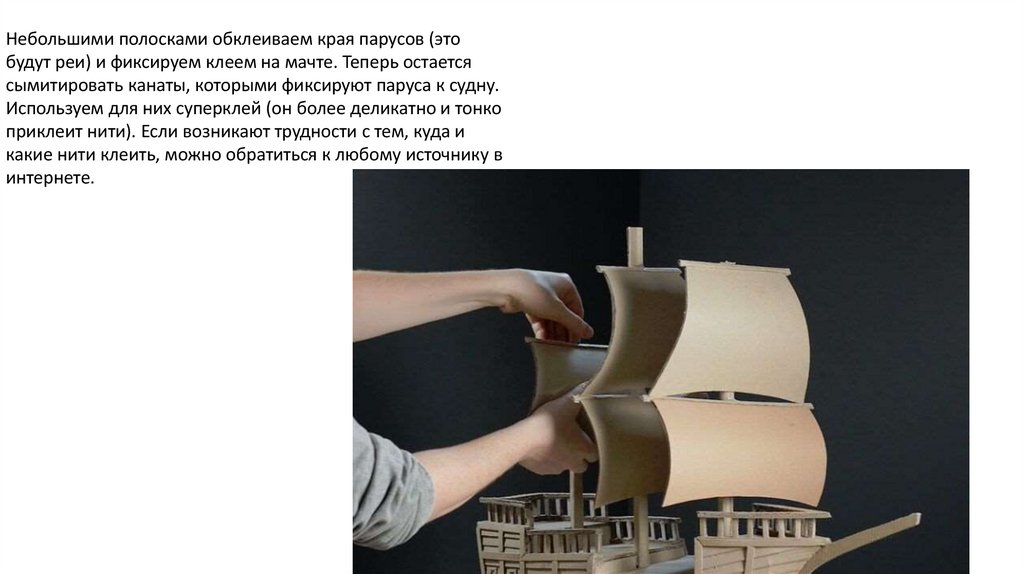 Небольшими полосками обклеиваем края парусов (этобудут реи) и фиксируем клеем на мачте. Теперь остается