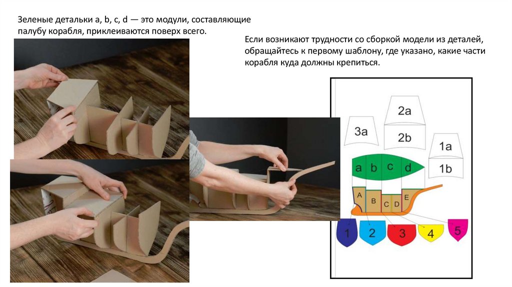 Зеленые детальки a, b, c, d — это модули, составляющиепалубу корабля, приклеиваются поверх всего.
