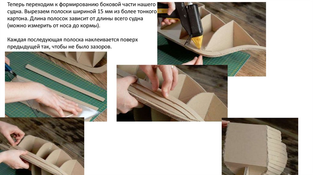 Теперь переходим к формированию боковой части нашегосудна. Вырезаем полоски шириной 15 мм из более тонкого