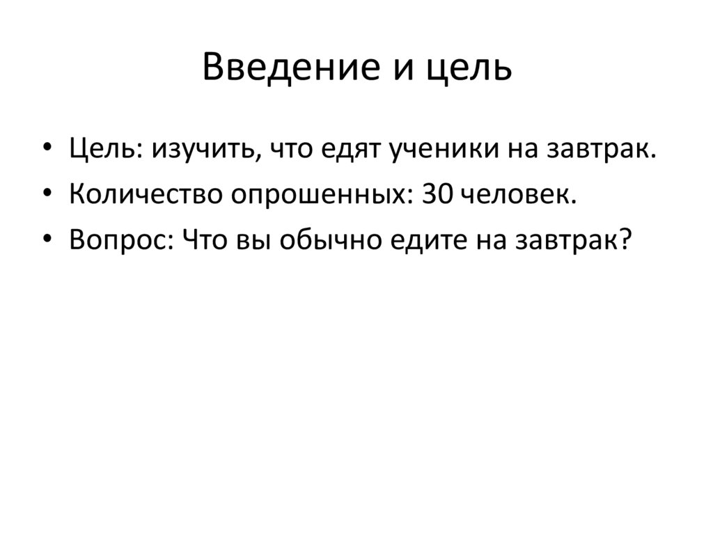Введение и цель• Цель: изучить, что едят ученики на завтрак.