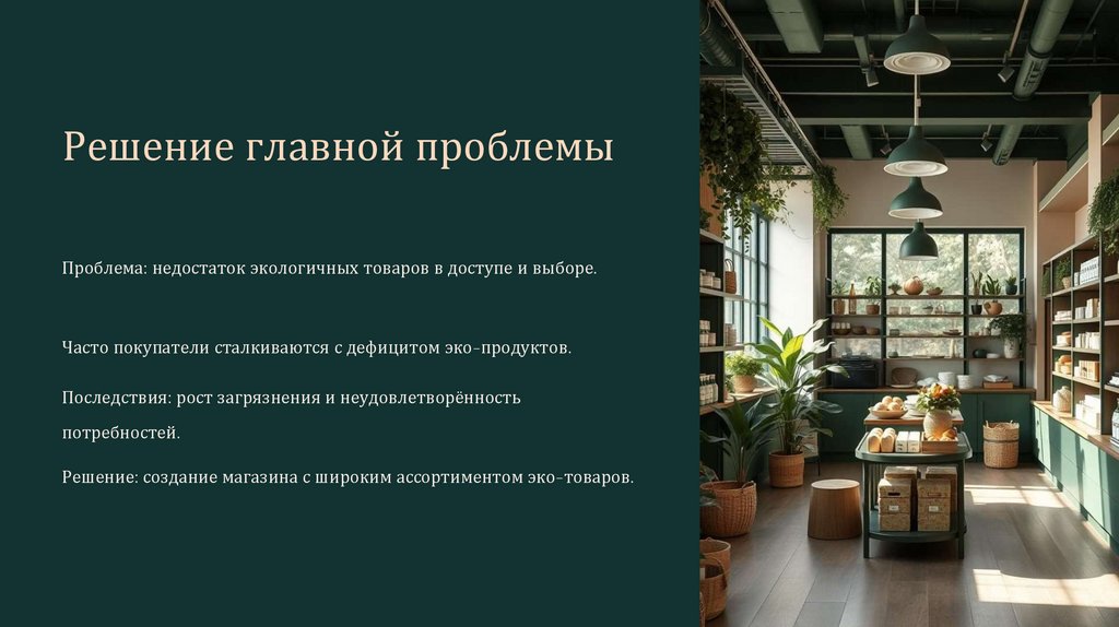 Решение главной проблемыПроблема: недостаток экологичных товаров в доступе и выборе.