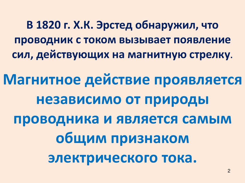 В 1820 г. Х.К. Эрстед обнаружил, чтопроводник с током вызывает появление