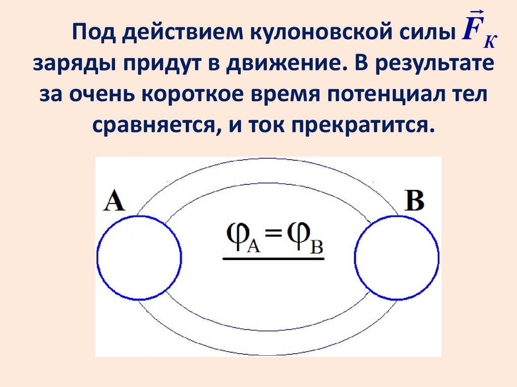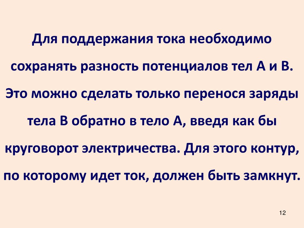 Для поддержания тока необходимосохранять разность потенциалов тел А и В.