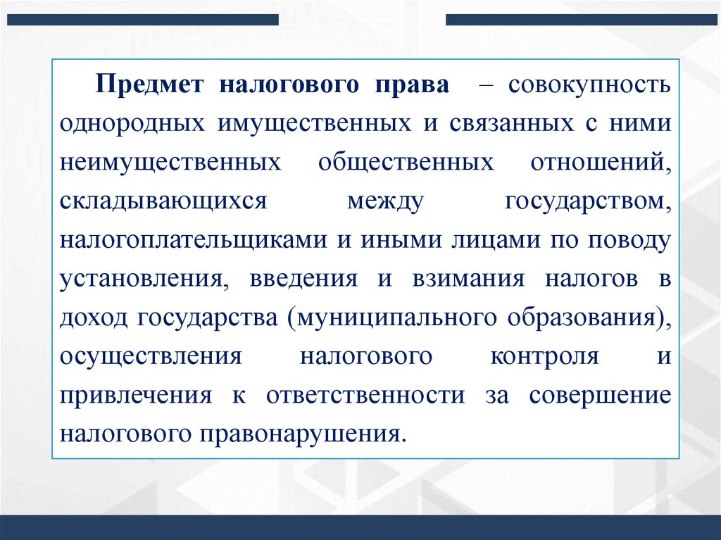 Предмет налогового права – совокупностьоднородных имущественных и связанных с ними
