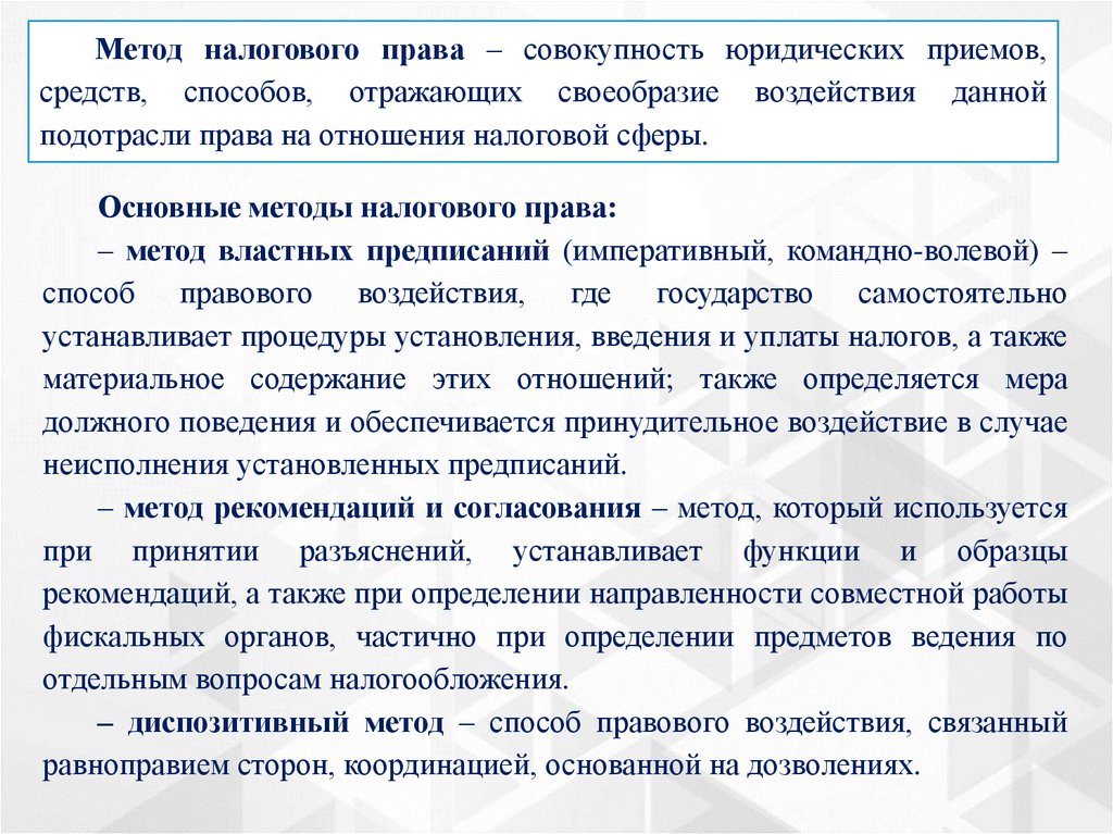 Метод налогового права – совокупность юридических приемов,средств, способов, отражающих своеобразие воздействия данной