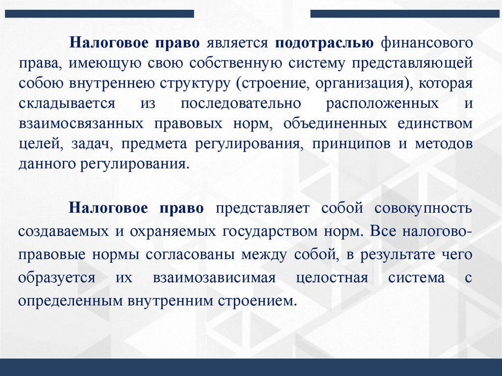 Налоговое право является подотраслью финансовогоправа, имеющую свою собственную систему представляющей
