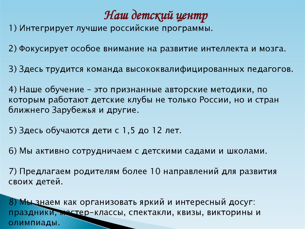 Наш детский центр1) Интегрирует лучшие российские программы.