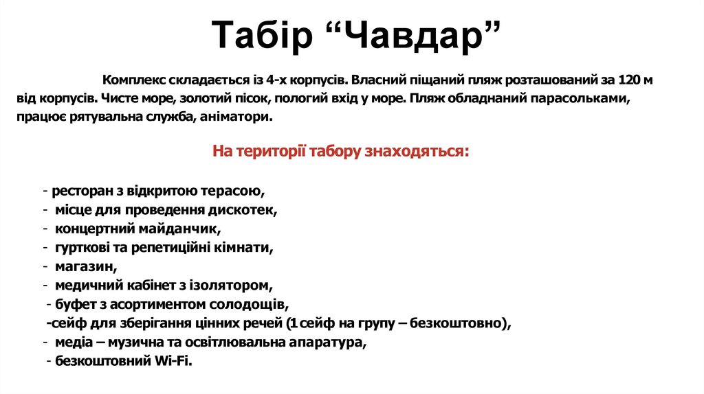 Табір “Чавдар”Комплекс складається із 4-х корпусів. Власний піщаний пляж розташований за 120 м