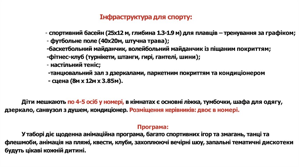 Інфраструктура для спорту:- спортивний басейн (25х12 м, глибина 1.3-1.9 м) для плавців – тренування за графіком;