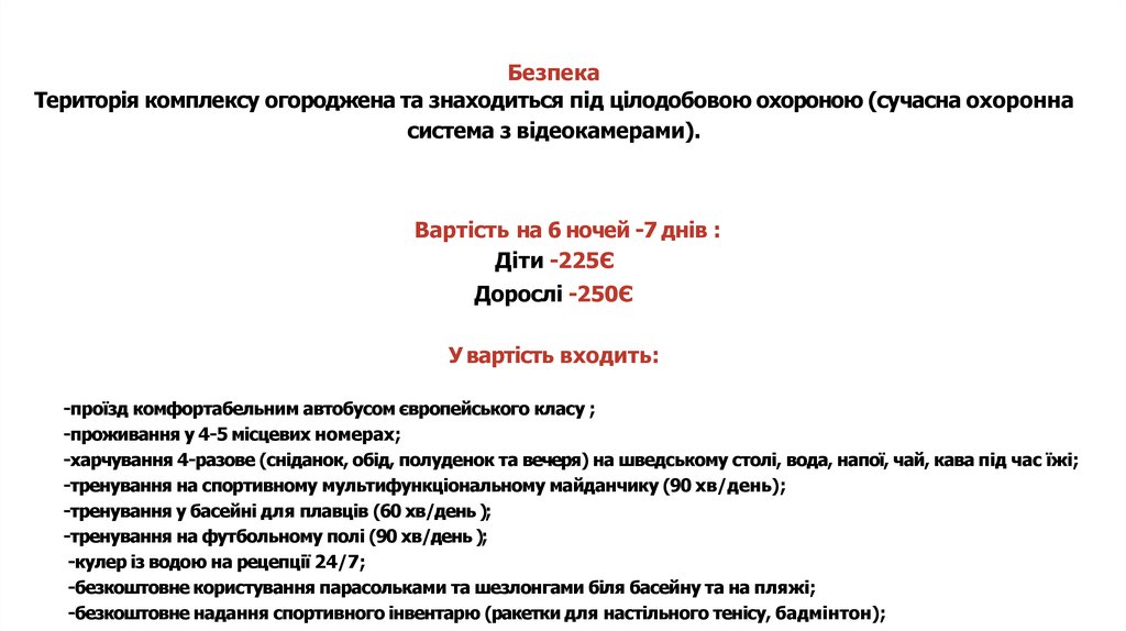 БезпекаТериторія комплексу огороджена та знаходиться під цілодобовою охороною (сучасна охоронна