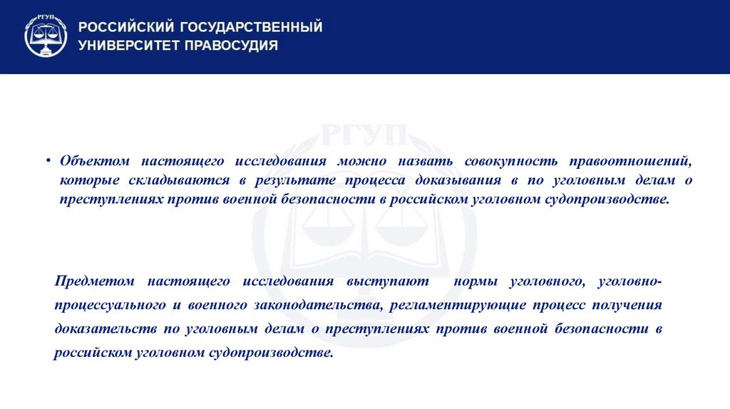 • Объектом настоящего исследования можно назвать совокупность правоотношений,которые складываются в результате процесса доказывания в по уголовным делам о