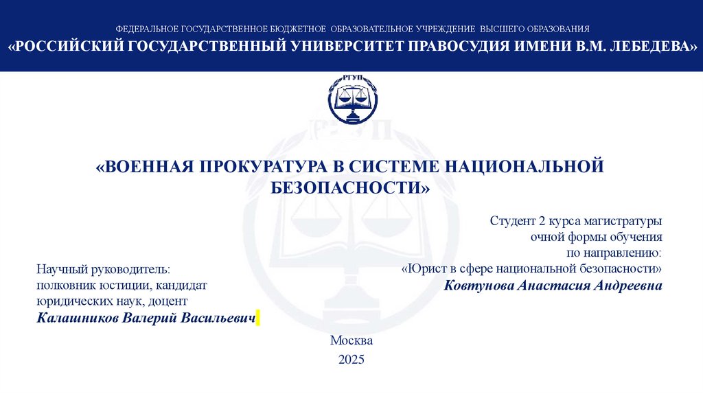 ФЕДЕРАЛЬНОЕ ГОСУДАРСТВЕННОЕ БЮДЖЕТНОЕ ОБРАЗОВАТЕЛЬНОЕ УЧРЕЖДЕНИЕ ВЫСШЕГО ОБРАЗОВАНИЯ«РОССИЙСКИЙ ГОСУДАРСТВЕННЫЙ УНИВЕРСИТЕТ ПРАВОСУДИЯ ИМЕНИ В.М. ЛЕБЕДЕВА»