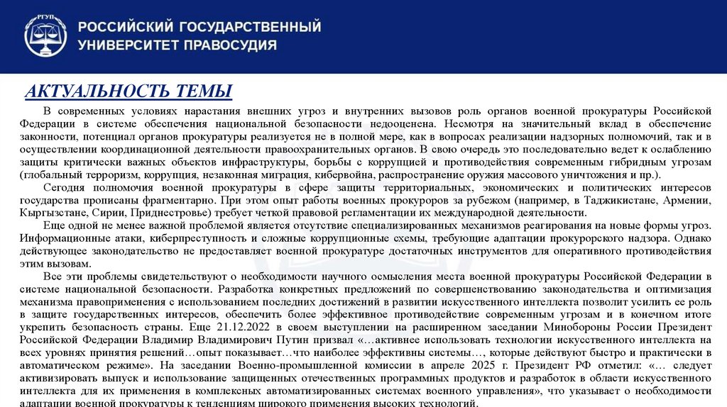 АКТУАЛЬНОСТЬ ТЕМЫВ современных условиях нарастания внешних угроз и внутренних вызовов роль органов военной прокуратуры Российской