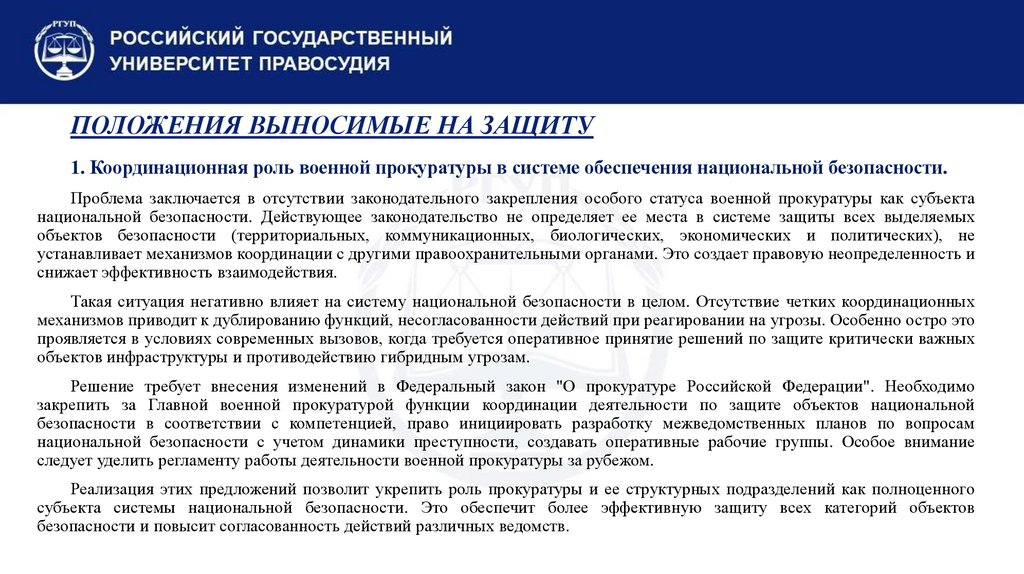 1. Координационная роль военной прокуратуры в системе обеспечения национальной безопасности.Проблема заключается в отсутствии законодательного закрепления особого статуса военной прокуратуры как субъекта