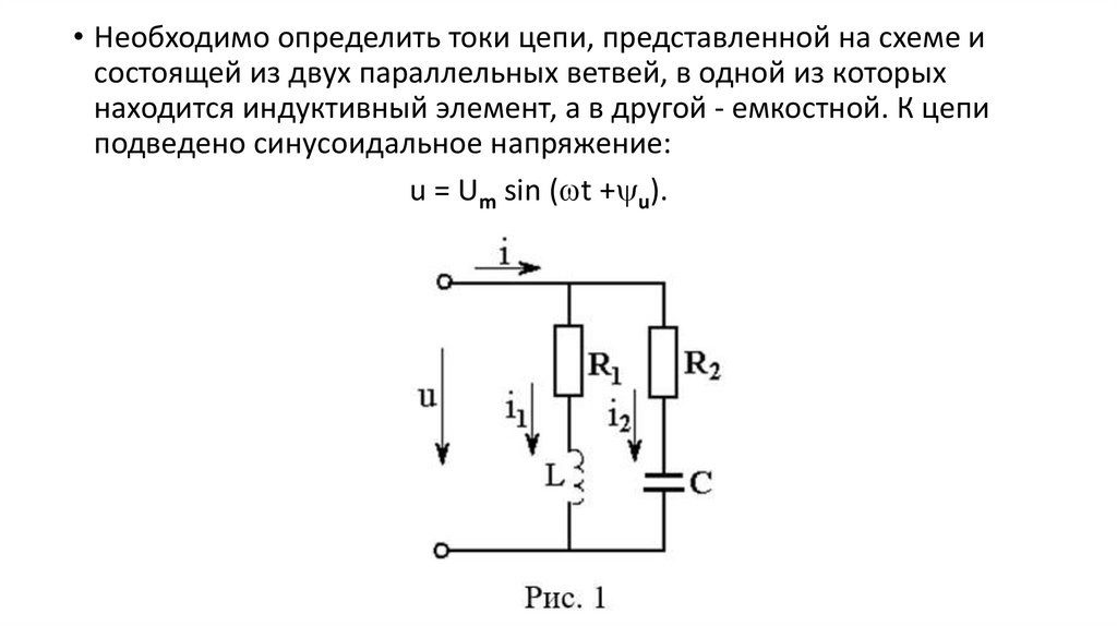 • Необходимо определить токи цепи, представленной на схеме исостоящей из двух параллельных ветвей, в одной из которых