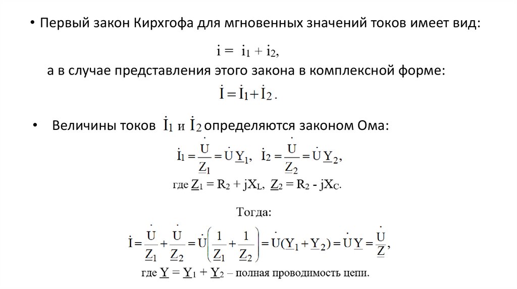 • Первый закон Кирхгофа для мгновенных значений токов имеет вид:а в случае представления этого закона в комплексной форме: