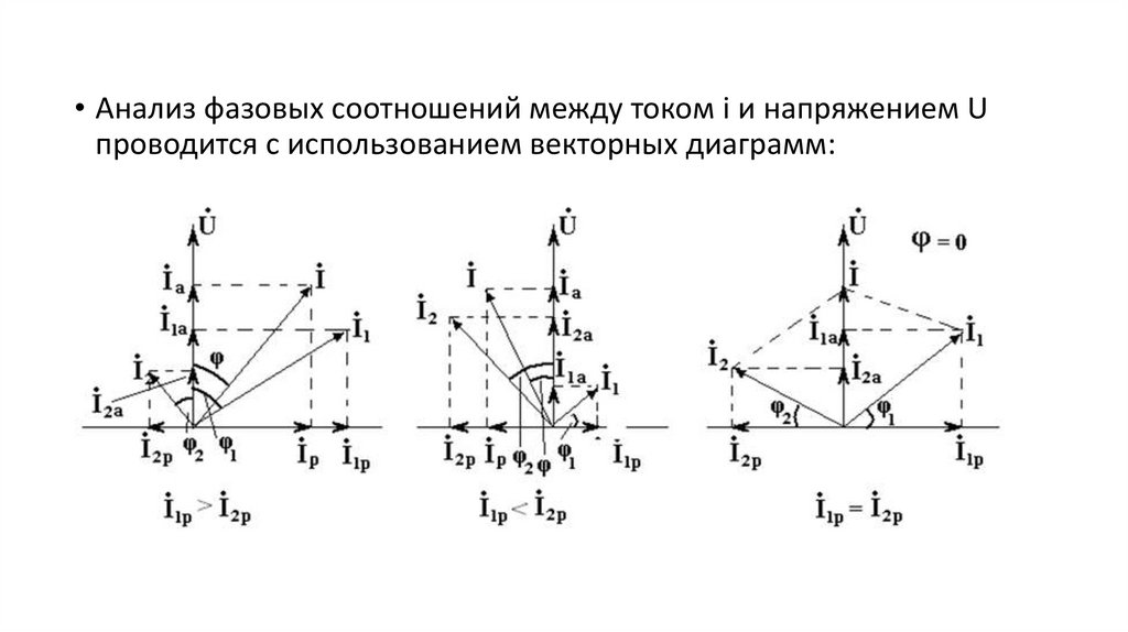• Анализ фазовых соотношений между током i и напряжением Uпроводится с использованием векторных диаграмм: