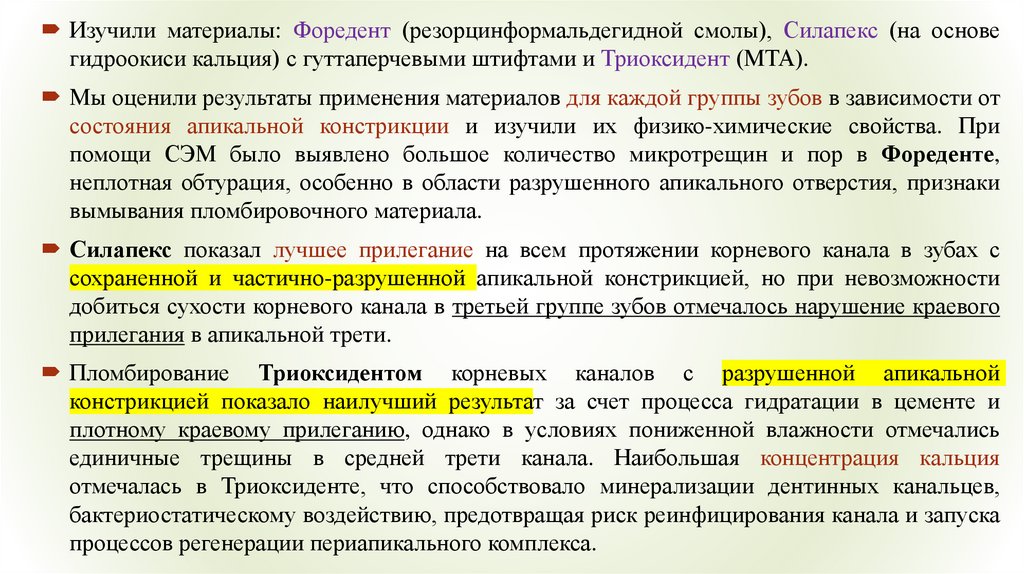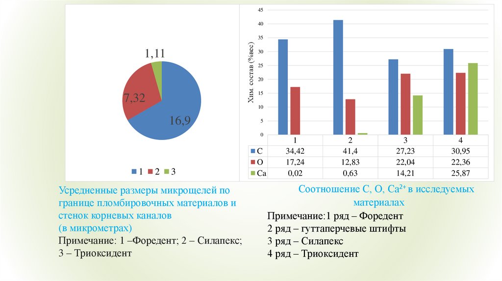 Концентрация Са в Триоксиденте, Силапексе и Фореденте составила 25,87; 14,21; 0,02 (вес
