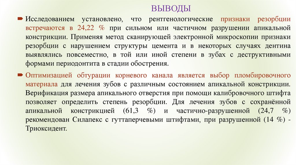 Исследованием установлено, что рентгенологические признаки резорбциивстречаются в 24,22 % при сильном или частичном разрушении апикальной