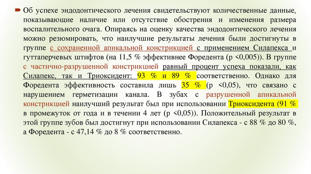 Силапекс, так и Триоксидент: 93 % и 89 % соответственно. Однако для