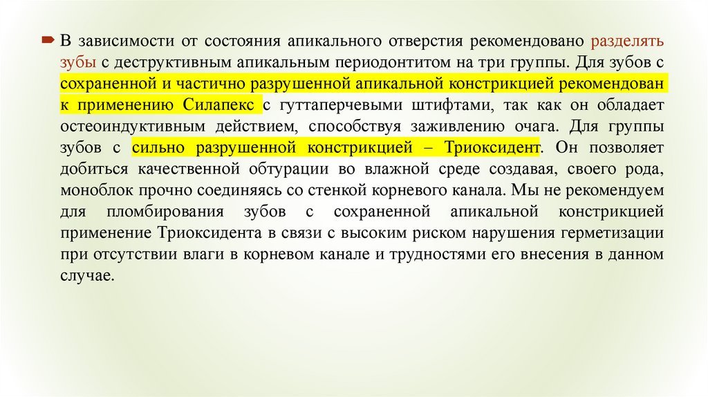 материала для лечения зубов с различным состоянием апикальной констрикции.